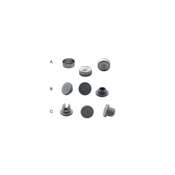 Closure set for 20 mm crimp-neck vials. Chlorobutyl stopper with aluminium crimp cap. Compatible with IVMN and IVMA series vials.