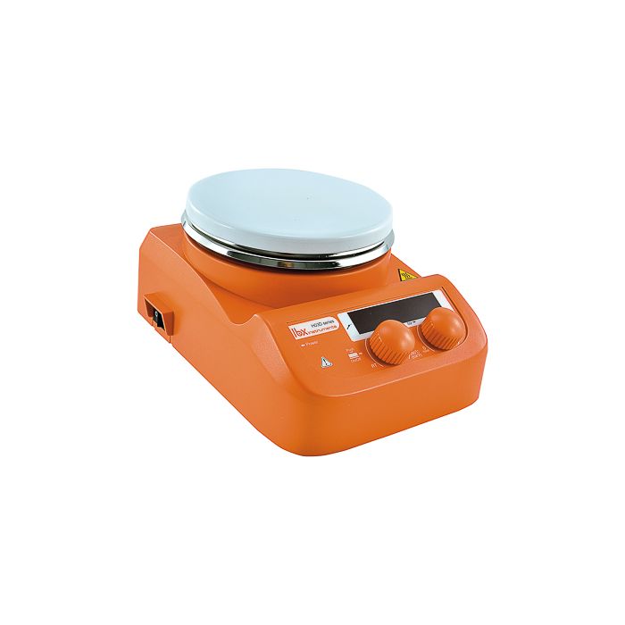 Magnetic hotplate stirrer designed for continuous laboratory use. Flame-retardant ABS housing, resistant to weak acids and bases. Ceramic heating plate and brushless motor — no maintenance required.