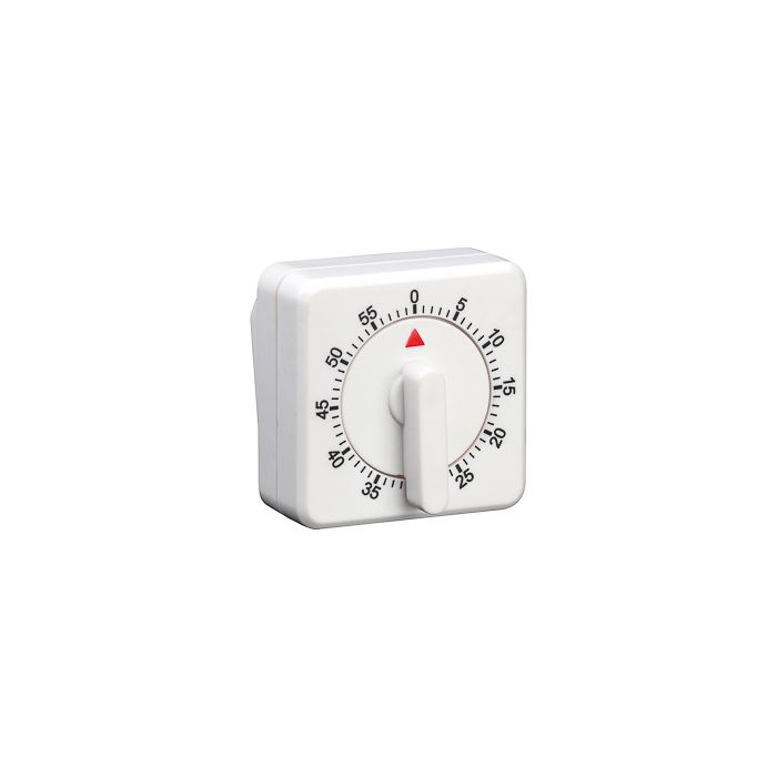 Turn the rotary dial to the required time. The wind-up mechanism counts down autonomously. At zero, the audible alarm signals the technician — useful when multiple processes are running simultaneously and continuous monitoring of a single instrument is not practical.