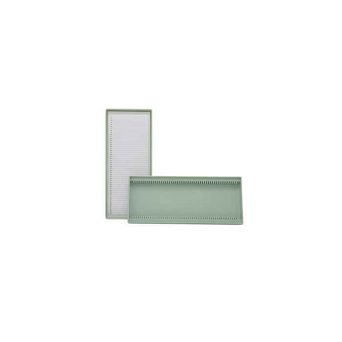 Characteristics of Microscope slide boxMade of polystyrene. With removable lid and numbered slots to hold microscope slides of 76 x 26 mm