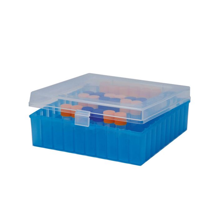Polypropylene box with integrated hinged lid for vial storage under extreme cold conditions or following autoclave sterilisation. Single-piece construction: the lid does not detach from the body.