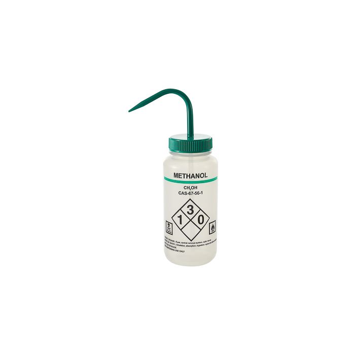 Characteristics of Safety wash bottle labelled wide mouthMade of LDPE (low density polyethylene) and PP closure (polypropylene). English print, highly visible and solvent resistant. Includes a Chemical Abstract Service (CAS) nº, National Fire Protection Association (NFPA) codes and symbols, Protective Equipment Symbol, Target Organ Information and Hazard codes. Screw cap colour-coded