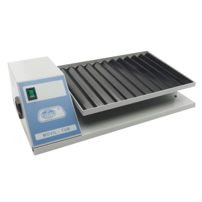 Continuous rocking shaker with a removable silicone tray. Maintains samples in homogeneous suspension in test tubes and comparable vessels—no spillage during operation.